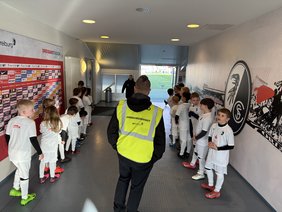 Ein Highlight war das Meet & Greet mit Torhüterin Laura Benkarth, die sich viel Zeit für die Kinder nahm und Autogramme verteilte. Anschließend ging es für die Kinder in die Kabine, bevor sie gemeinsam mit den Profis ins Dreisamstadion einlaufen durften.