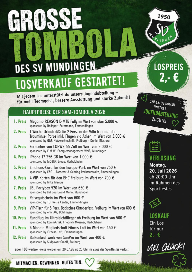 Der SV Mundingen freut sich, den Start des Losverkaufs für die große Tombola im Rahmen des diesjährigen Sportfestes bekanntzugeben. Ab sofort sind die begehrten Lose erhältlich – und auch in diesem Jahr lohnt sich die Teilnahme ganz besonders.